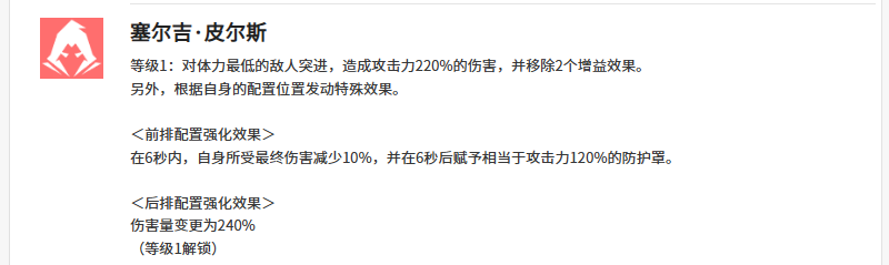 二技能“塞尔吉皮尔斯”具备智能索敌与战术增益双重特性:自动锁定当前生命值最低的敌方单位,造成220%攻击力的伤害,并清除目标身上两个增益效果。站位差异将触发不同强化路径——若处于前排,施放后6秒内自身最终伤害降低10%,但随即获得等同于120%攻击力的护盾;若位于后排,则直接提升自身20%伤害输出。这种基于布阵位置的动态加成机制,赋予米里昂极高的阵容适配弹性。