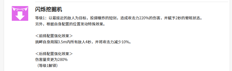 辅助技能“闪烁挖掘机”以近距离敌人为基准发动爆炸攻击,造成200%攻击力伤害并附加2秒眩晕。该技能同样存在站位差异化效果:前排释放时,米里昂自身攻击力降低10%,但影响范围扩大至周围3.5米内的全部敌人;后排释放则将伤害提升至280%攻击力,进一步强化其远程压制能力。