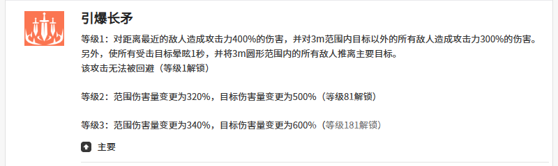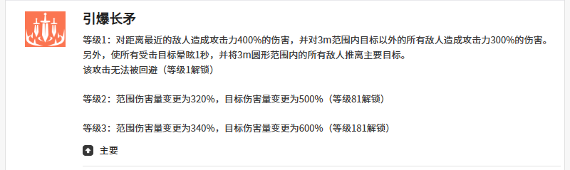 其一技能具备强力范围控制与爆发联动效果:首次攻击对主目标造成400%攻击力的伤害;同时,在3米半径内对其他敌人追加300%攻击力的群体伤害。所有受此技能命中的敌方单位将被强制击退,并陷入1秒眩晕状态。该机制不仅有效打乱敌方阵型,更能快速分离敌方核心输出角色,为团队创造集火窗口,显著提升单局节奏掌控力。