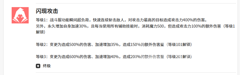 终极技能“闪现反击”兼具高爆发与长效增益:对敌方当前攻击力最高的单位发动连续斩击,造成400%攻击力伤害;成功释放后,本关卡内永久提升自身30%攻击力。该技能消耗500点魔力,但可使后续所有攻击附带100%额外攻击力与100%额外生命值伤害。此外,其支援技能“超频加速”专为后排友军设计,提供25%伤害加成与25%行动速度提升,显著增强团队整体输出节奏与生存韧性。