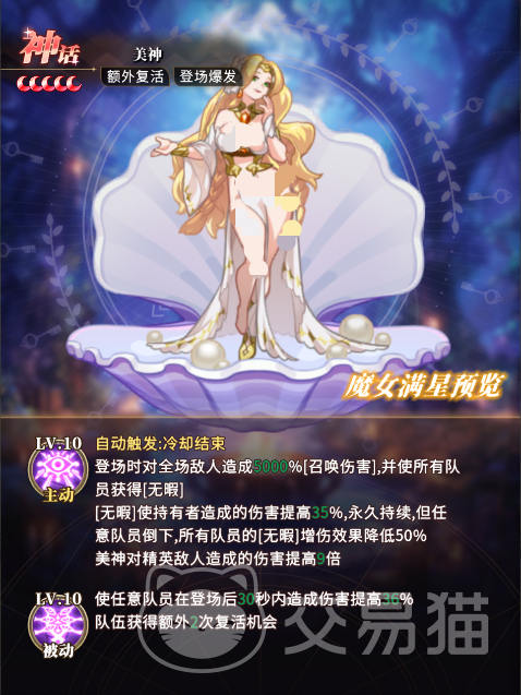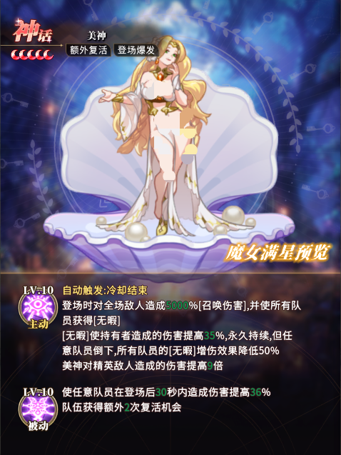 美神的主动技能在登场瞬间触发全场范围伤害,并赋予全体队友“无瑕”状态——该状态可永久提升队伍整体伤害输出。需特别注意:一旦任一队友被击倒,“无瑕”带来的增伤效果将衰减至原始值的50%。因此在阵容构筑阶段,应优先选择具备高生存能力或快速恢复能力的协同时角色。此外,其被动技能具备全局覆盖特性:无论当前哪位角色执行攻击动作,美神均可持续为全队叠加伤害增益;同时提供额外复活次数,使倒地队友可立即重返战场继续输出,从而显著延长队伍的整体作战续航能力。