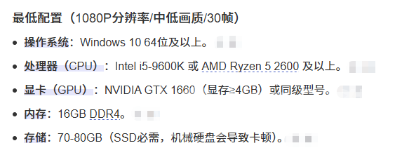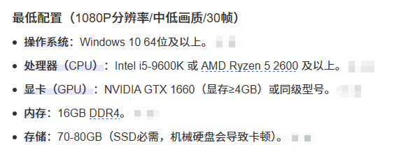 官方公布的最低配置标准为支持1080p分辨率输出,确保基础画面可正常呈现。推荐显卡为NVIDIA GeForce RTX 4060或同级产品,该级别可稳定支撑高画质模式下的全局光照、Nanite几何体与Lumen动态反射效果,使每一帧画面都具备电影级视觉张力。其余硬件参数请参考下方配置图表,达标即具备可运行基础。