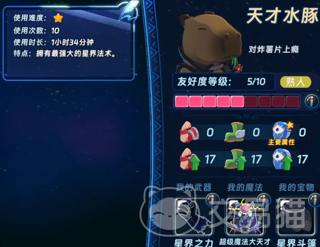 属性定位上,卡比巴拉偏向纯魔法输出路线,魔攻成长显著,但生命、防御等生存向属性相对基础。其实际伤害表现高度依赖友好等级——每提升1级友好度,星界魔法的基础倍率即获得可观增幅;升至友好10级后,单次流星伤害足以对普通小怪实现一击清屏效果,大幅缩短战斗节奏。