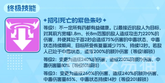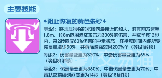 她的主动技能“黄色朱砂”具备双重打击逻辑:首段为直线喷射式范围攻击,对正前方目标造成300%攻击力伤害;随后进入12秒持续中毒状态,期间每2秒触发一次60%攻击力的毒伤。该中毒效果同步附带50%治疗削减,并可清除目标身上最多200%数值的增益效果——这一机制使其在对抗依赖护盾、回血或增益循环的敌方阵容时具备显著战略价值。