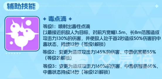 辅助技能“毒点滴”提供近距精准挂毒能力,单次命中造成130%攻击力伤害,并开启持续10秒的周期性毒伤,共触发6次,每次间隔2秒、伤害为50%攻击力。“合成肾上腺素”则转向团队赋能,在10秒内提升指定队友20%生命上限与20%攻击力,同时额外增加10%暴击率——此技能特别适配高爆发或高暴击依赖型主力输出角色,强化其短时间内的极限压制能力。