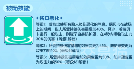 被动技能“伤口恶化”进一步放大中毒收益:所有被瑞贝卡造成伤害的目标,其后续所受全部伤害提高40%;同时,每当她完成一次普通攻击,即可获得一层持续4秒的吸收护盾,可抵消敌方30%攻击力的伤害。该被动与中毒类技能形成正向循环——毒伤频率越高,触发护盾越频繁,生存压力越低,持续作战能力越强。