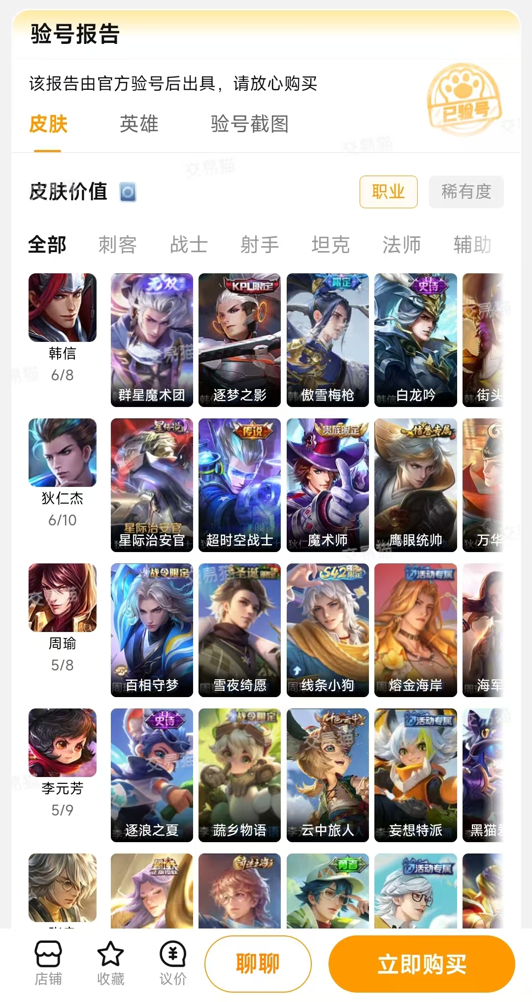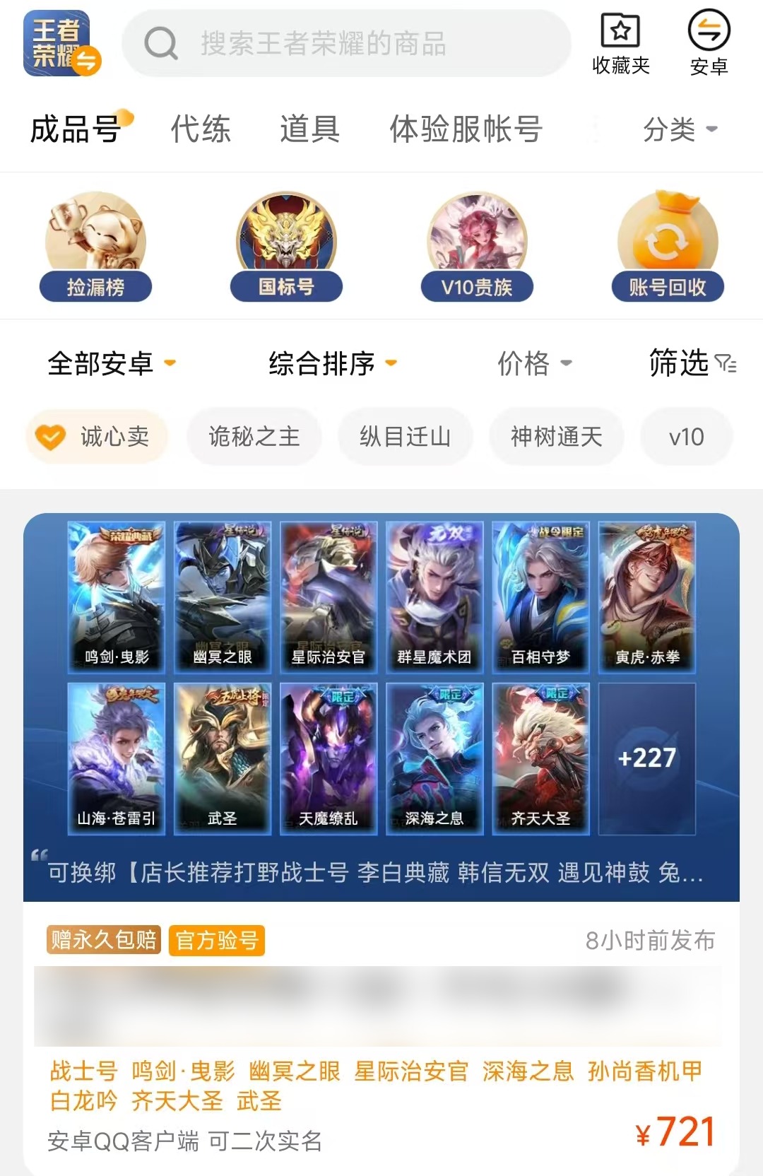 如果说愿意等待合适的机会出售账号的话,也能估值后上架代售。交易猫对于成品号有赠送永久包赔服务,且交易猫上的注册用户早已超越了一亿的用户量,再加上还是王者荣耀这样的游戏,不愁没有合适的买家。如果玩家担心自己被骗号的话,可以选择交易猫上的【验号报告】来证明自己账号的真实性,同时也能增加自己账号的曝光率,这样也能加速促成交易。同时经过验号的账号也有相应的验号报告,建议卖家们将报告上传到商品详情页,减少后续账号内容扯皮的风险。