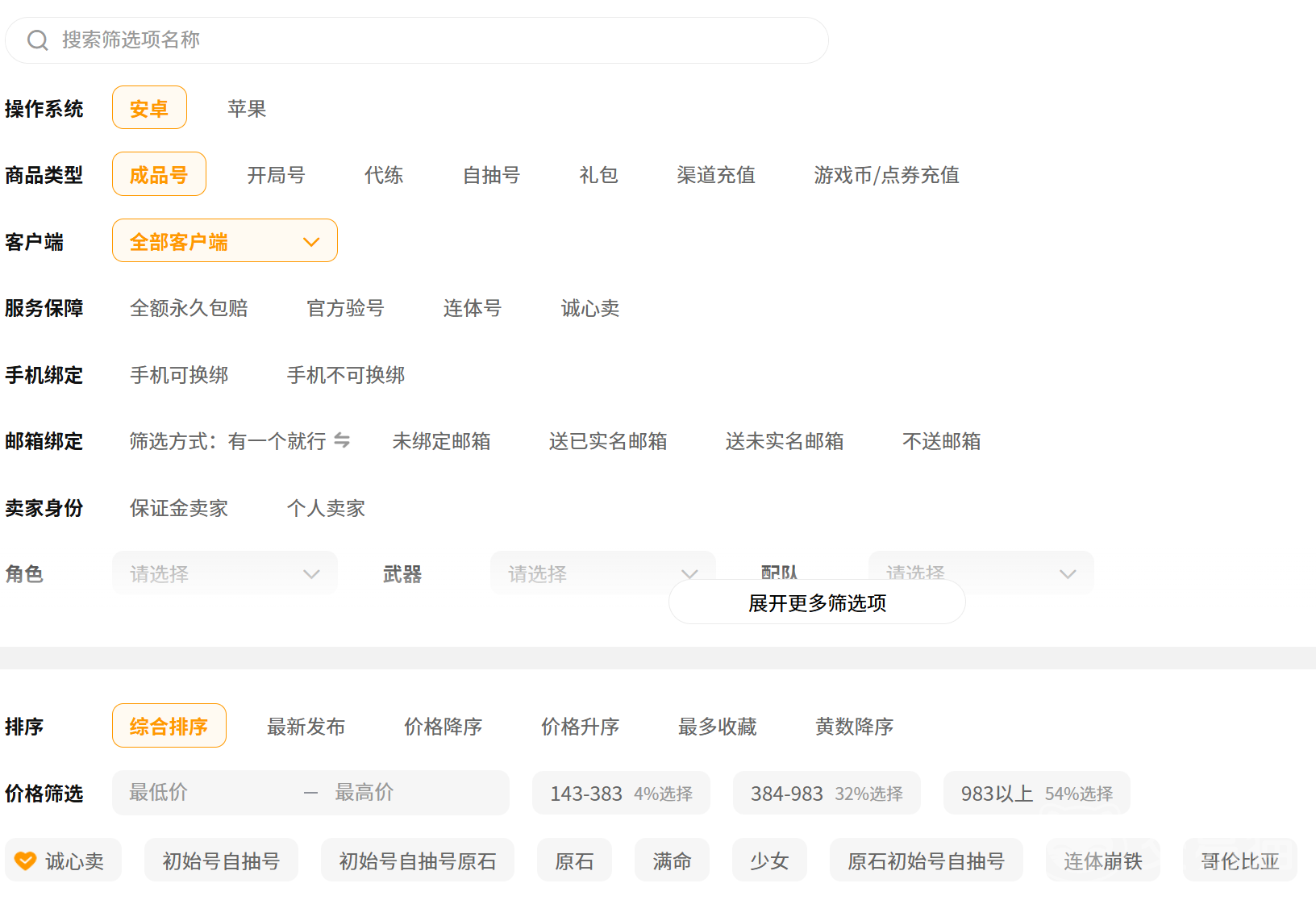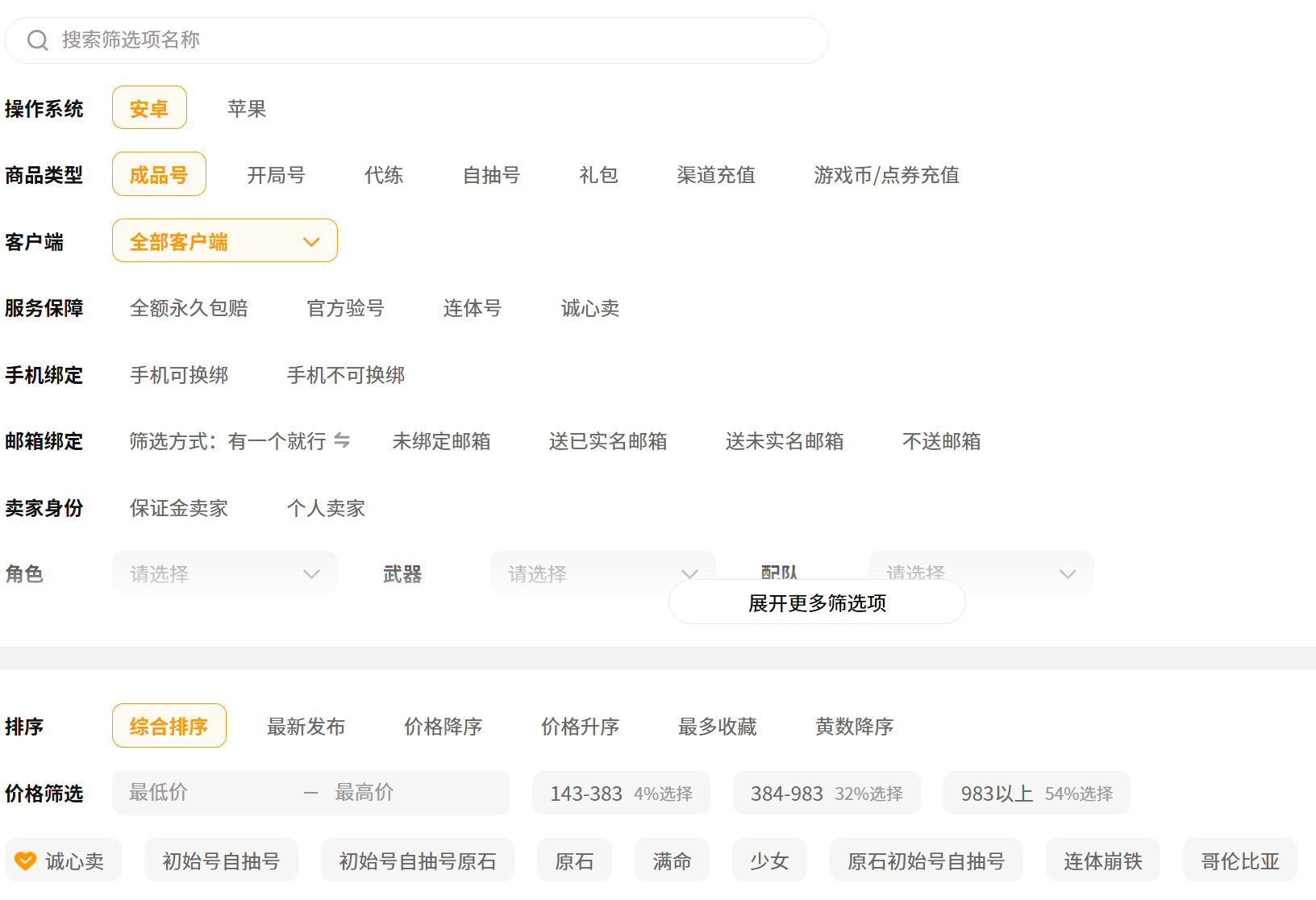 除了系统免费估价,交易猫的游戏专区也是一个估价的好帮手。涵盖了6000多款游戏,100多万商品在售,进入交易猫app后,在搜索框输入原神,点进去搜索,就能看到原神专区入口,这里边的账号五花八门,为了精准找到参考对象,要利用筛选功能,先按照账号类型然后再关注账号的角色和武器配置,筛选跟自己同类型的游戏账号,对比这些同类型同等级相似配置的账号价格,你心里就能对自己账号的价值有个大概判断,辅助你更准确的给账号定价。