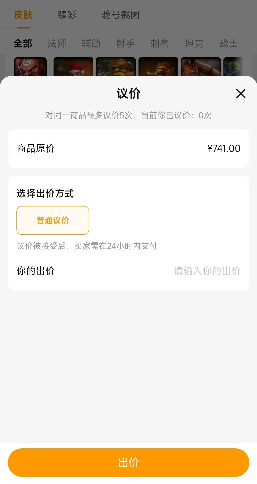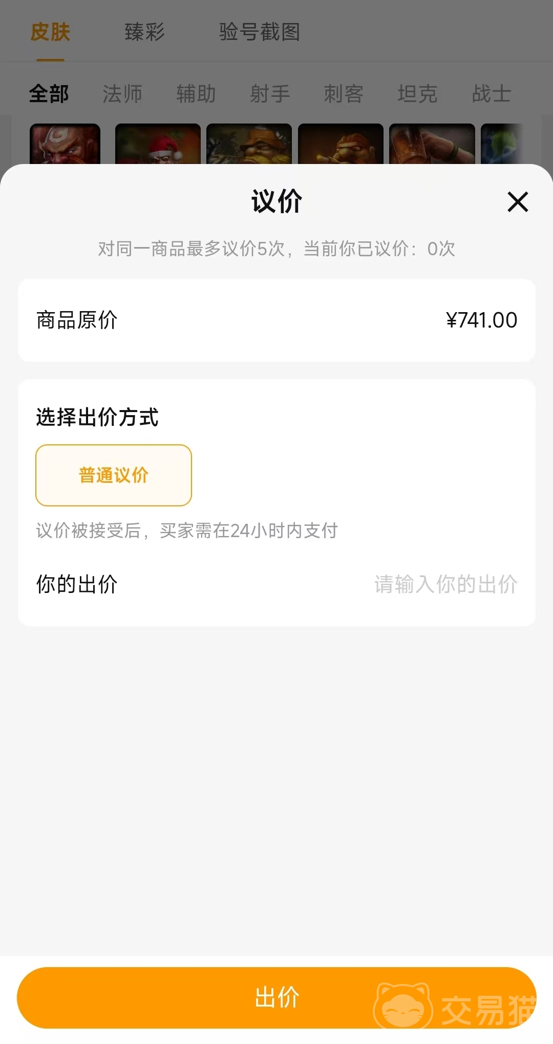 玩家选择交易猫来进行交易,在价格上也可以进行商讨。每个商品的详情页面上不仅有关于账号的详细内容,也可以在这个页面上和卖家聊一聊,甚至也可以利用页面上的【议价】功能来提出自己心仪的账号价格。如果说卖家不同意你的出价,你还可以继续出价,一个账号有5次的出价机会。一旦卖家同意你的出价,需要在24小时完成支付,否则本次议价无效。在出价后可以通过关注交易猫的微信公众号或者是订阅账号来及时了解议价相关的消息或者是账号降价的动态消息。