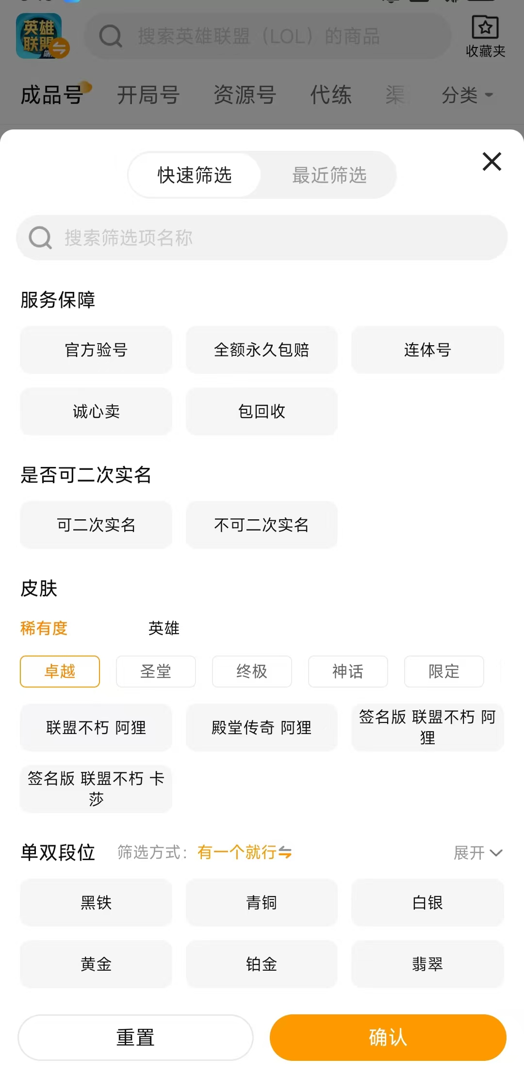 英雄联盟这款游戏的相关账号内容在交易猫上数量众多,玩家们可能需要挑选很久才能选到自己想要的账号,其实可以充分利用平台的【筛选】功能,在筛选时可以精准的选择皮肤稀有度、段位、臻彩皮肤、英雄数量等多个内容,玩家填写的约详细,最后筛选出来的账号越加匹配玩家的需求。