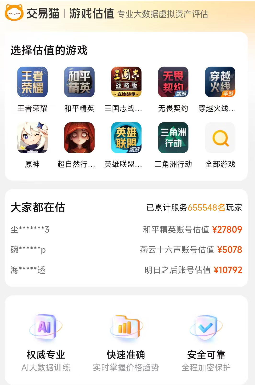 在账号出售之前,玩家们最需要考虑的问题就是账号的价格到底值多少,很多玩家是不太了解市场行情的,很容易出现定价过高的情况,导致账号的出售速度很慢,那么就可以使用交易猫的价格估价功能,该功能可以帮助玩家们快速估算出价格,而这个价格是符合目前市场的,后续如果在交易猫平台售卖的话,出手的速度是会快很多的,而且该平台广泛汇聚6000余款各类精品游戏,轻松实现全品类覆盖,100万+件商品常年在线在售,已累计服务超7000万玩家用户,想要使用交易猫平台的话,安卓用户通过上方按钮下载,而ios用户则可以直接到交易猫官网使用哦。