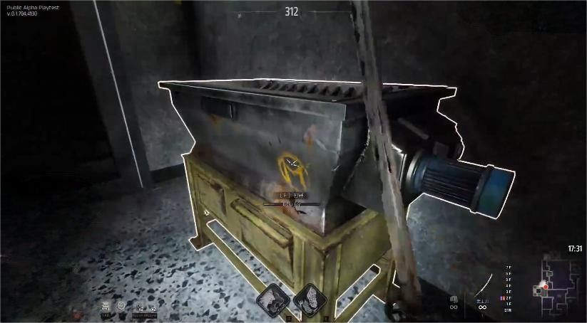 粉碎机并非设置于主建筑外围或常见物资点附近,而是固定部署在二层楼梯区域的特定方位:位于整层平面最左侧,紧邻上行楼梯右侧扶手末端。当角色靠近时,机器处于持续运转状态,可直观观察到机械部件的动态反馈,并自动触发交互提示框,点击即可启用功能。