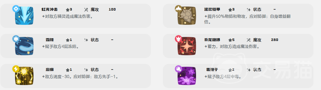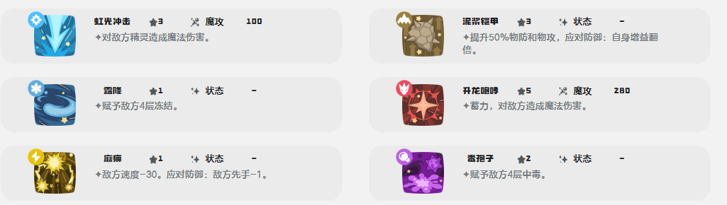 若侧重魔法输出,可选用“升龙咆哮”——该技能需1回合蓄力,随后大幅提升魔攻数值,适合预判敌方换宠节奏后打出高额爆发;若需补充控场能力,则“麻痹”是优选,命中后降低敌方30点速度,并附加微量新手数值削减,有效削弱对手先手权,增强己方行动主动权。