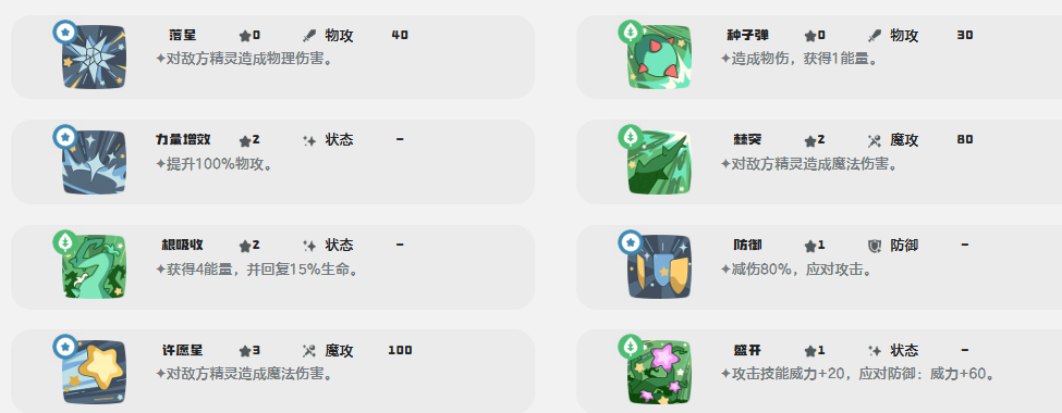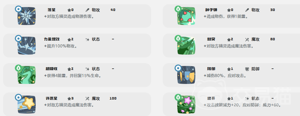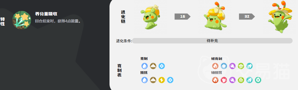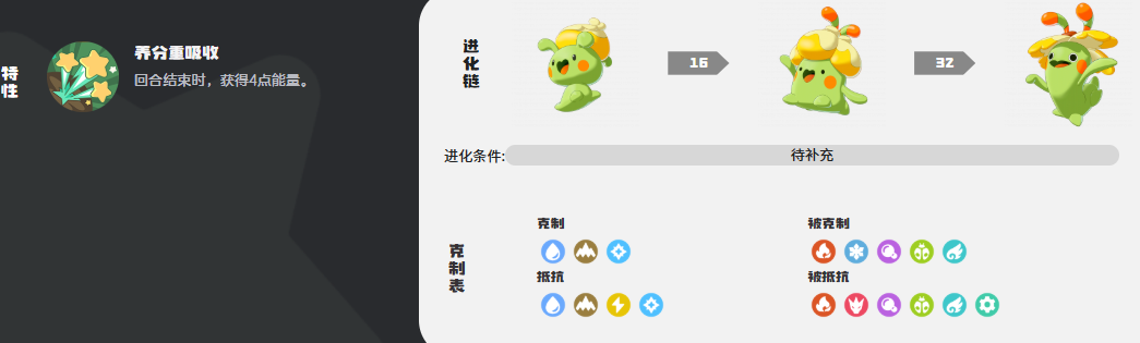 奇丽花的核心机制围绕“能量循环”展开:其特性可在每回合结束时自动恢复4点能量,为持续施放技能提供基础保障。基础技能方面,“种子弹”提供物理输出并附带1点能量返还;“超吸收”则在登场首回合立即获得4点能量,并恢复15%最大生命值,兼顾续航与节奏启动。“许愿星”为低魔攻系数的魔法伤害技能,实战中多用于补刀或过渡;而“光能聚集”是关键输出技——不仅造成魔法伤害,且每次使用草系技能后,均可使该技能基础威力提升60点,形成越战越强的滚雪球式输出模式,虽消耗较高,但爆发成长性极为显著。