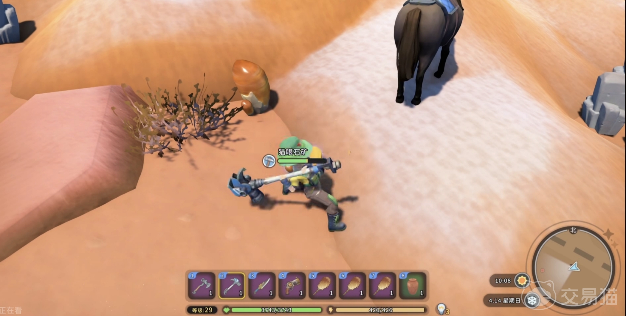 第二类获取途径为战斗掉落机制:在中桥对岸小山丘范围内,存在一定数量的敌对单位“岩爪守卫”。击败该单位后,有概率直接掉落完整猫眼石矿(非碎片),掉落率约为37%。参与该行动前,需确保装备具备基础近战攻击能力的武器(如铁锤或强化镐)、至少3组采矿辅助工具,以及2瓶以上生命恢复药剂。该路径虽耗时略长且存在风险,但单次战斗收益上限更高,适合中后期已配置防护装束的玩家尝试。