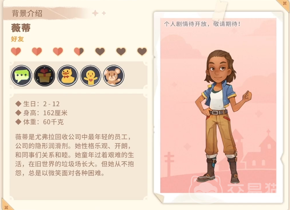 在《沙石镇时光》这款开放世界模拟经营游戏中,NPC薇蒂是一位极具辨识度的角色。她就职于尤弗拉回收公司,性格沉稳而阳光,待人亲切,是团队中不可或缺的协调者。其成长背景也颇具感染力——童年时期与薇薇奶奶相依为命,在旧世界废土垃圾场中生活,却始终以豁达心态面对困境,展现出坚韧又温暖的人格魅力。