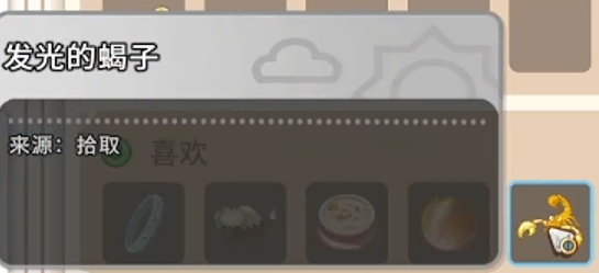 若尚未掌握相关制作配方或材料暂缺,可优先考虑野外采集类替代品。“发光的蝎子”属于地图常规掉落物,分布广泛、拾取便捷,虽归属“喜欢”而非“非常喜欢”档位,但胜在零成本、易重复获取,适合日常维系好感。相比之下,猫眼石与书籍虽同样受青睐,但获取路径较窄、资源占用较高,不建议作为主力馈赠选项。