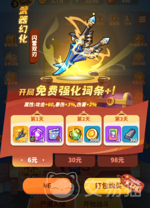 游戏中植物角色除基础技能外,支持装备专属武器以强化实战表现。例如“闪雷双刃”即为可购幻化武器之一,提供三档定价方案:入门档售价6元,购买后可连续3天领取指定奖励,并同步提升全队攻击强度与暴击伤害数值。该类道具适合希望在中前期快速建立战力优势的玩家。