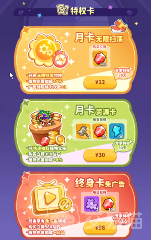 月卡系统是本作高频使用的付费模块。基础月卡定价12元,生效期为30天,权益包含不限次数关卡扫荡权限、角色伤害加成及120枚宝石;进阶月卡售价30元,同样覆盖30日周期,在基础权益之上额外开放高概率植物宝箱抽取通道,并叠加更高幅度的战斗属性增益。此外,终身免广告服务标价98元,除彻底屏蔽全部广告干扰外,还将一次性发放980钻石,并附带角色伤害提升效果。
