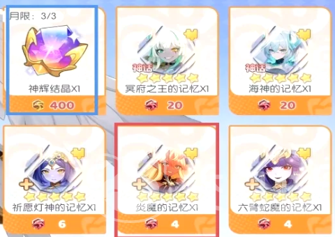 【圣王争霸商店】炎魔的记忆碎片为当前版本最高效幻灵养成资源,必选;红币充裕时可追加神话幻灵的记忆;神辉结晶仅在存在神格硬性门槛时兑换;跨服阶段后,资源倾斜顺序调整为:大恶魔 → 大天使 → 月神铃鹿。