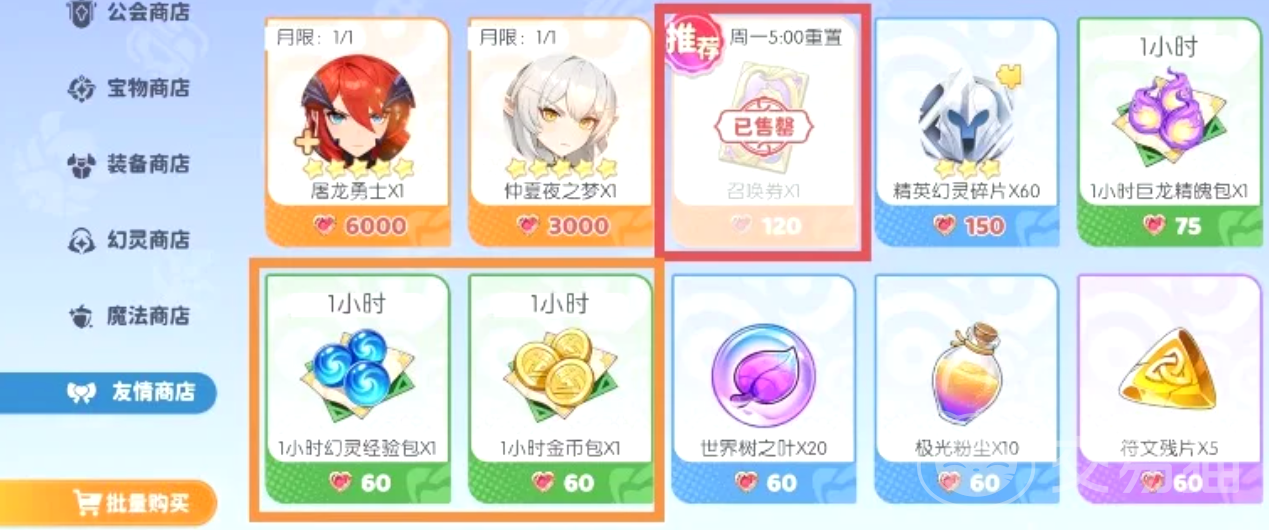 【友情商店】召唤券建议每周稳定获取,维持幻灵池活跃度;其余物品依个人阵容缺口灵活选择。