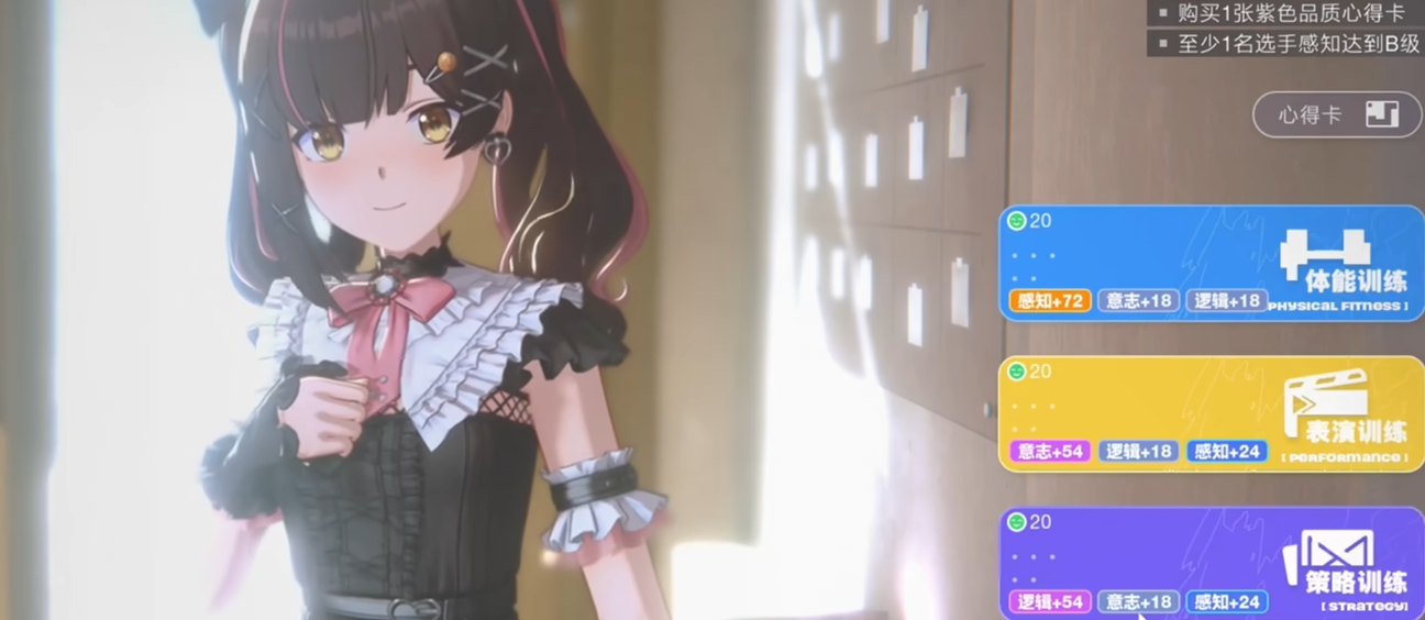 训练系统直接影响角色基础属性成长。其中,“意志”属性影响心得卡技能的实际生效概率与效果强度。训练过程中还可激活协同增益机制:当勋章值或勋章数量达到指定阈值,同场参与训练的其他角色将同步获得额外属性加成。当前训练类型共设三类——体能训练、表演训练与策略训练,各自对应不同维度的能力强化方向。