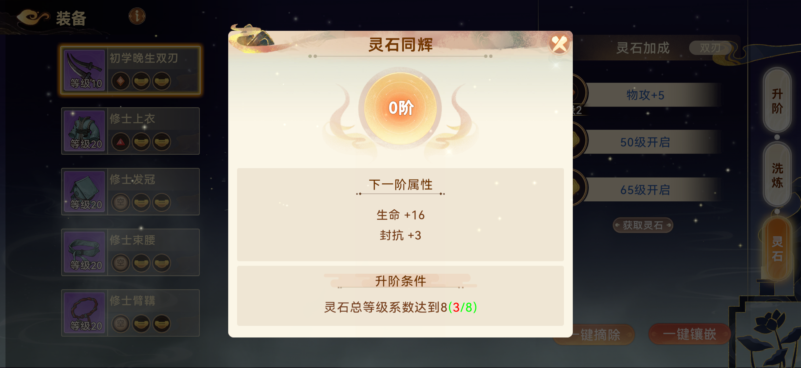 “灵石同辉”效果并非独立存在,其实质为多枚灵石协同触发的阶位型增益体系。该效果的阶级提升严格依赖已镶嵌灵石的总等级——单颗灵石无法达成升阶门槛,建议优先开启双卡槽后再集中资源提升两枚灵石等级,以高效推进同辉阶级。阶级越高,武器附加的特效伤害、属性穿透率及特殊状态触发概率同步增强。