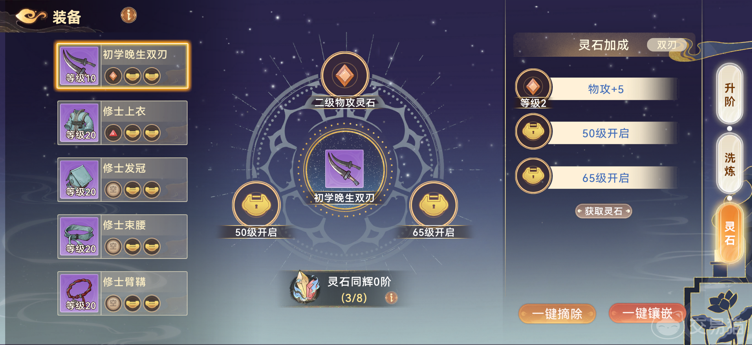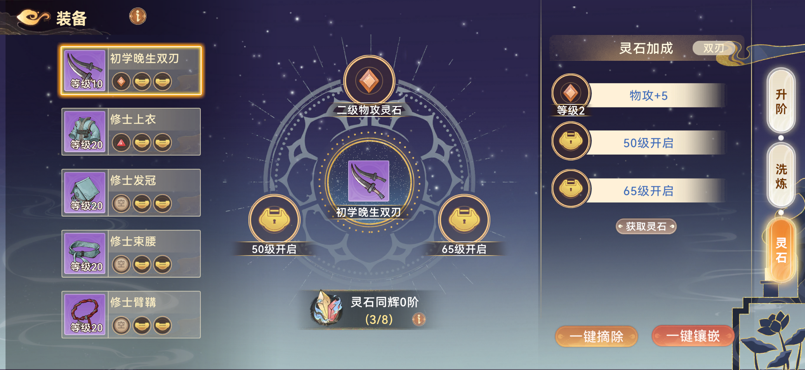 灵石系统于玩家达到指定等级后开放,属于进阶玩法模块。每位角色可为单件武器装配最多3枚灵石,不同颜色对应攻击、暴击、穿透等专属属性,品阶则决定基础加成强度。灵石卡槽需随角色等级提升逐步解锁:首槽默认开启,第二槽需达30级,第三槽需完成特定主线章节并满足等级条件。除灵石装配外,装备本身还可通过洗炼、升阶等方式叠加战力。