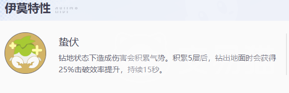 需注意的是,钻地状态并非绝对防御:地震类技能仍可对其造成有效打击。花芽蟹的两大特性“蛰伏”与“蓄势待发”均需在钻地状态下激活。前者可在积蓄5层气势后破土而出,提升自身25%攻击力并附加额外击破概率,持续15秒;后者则依据所受伤害叠加层数,满5层时提升50%击破效率,并生成一个提供8%防护值的护盾——该护盾正是其关键突袭手段的释放前提。