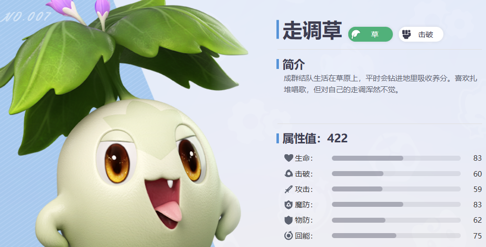 走调草则侧重控制与削弱,开局即可施加虚弱状态,降低敌方抗性,为花芽蟹及其他输出角色创造更优的打击环境。在生存体系已由花芽蟹的钻地机制及治疗位共同构筑的前提下,该角色无需承担过多承伤压力,专注发挥其控场效能即可。三者功能分明、互为支撑,使整套阵容在输出、防御、控制、恢复四个维度达成动态平衡。
