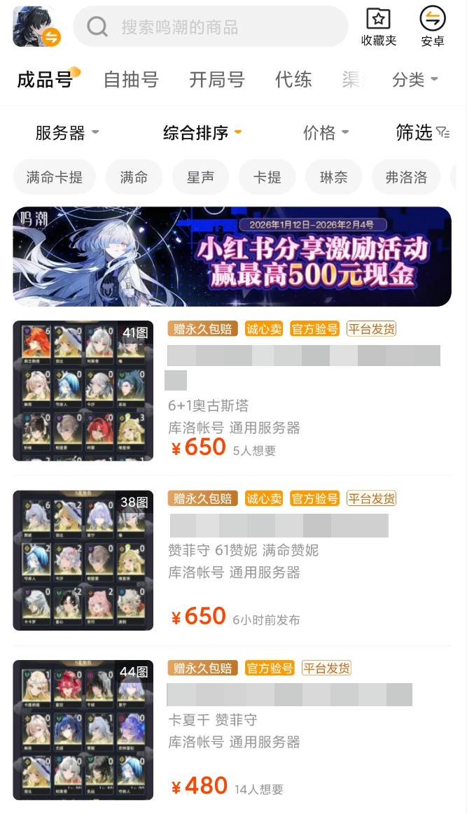 上百万款商品同时在售可非浪得虚名,搜索鸣潮进入到专区,映入眼帘的便是各种价格介绍的账号在,账号的标题当中,你能够看到非常多稀有的角色以及高昂的战斗力,点击进入详情页即可看到该账号所有的角色、武器、服饰、资产以及平台所出具的验号报告,是无论是各种满命卡提一手号,或是能够捡漏的便宜资源账号这里都有,还能够设置价格由低到高的排序或者筛选。