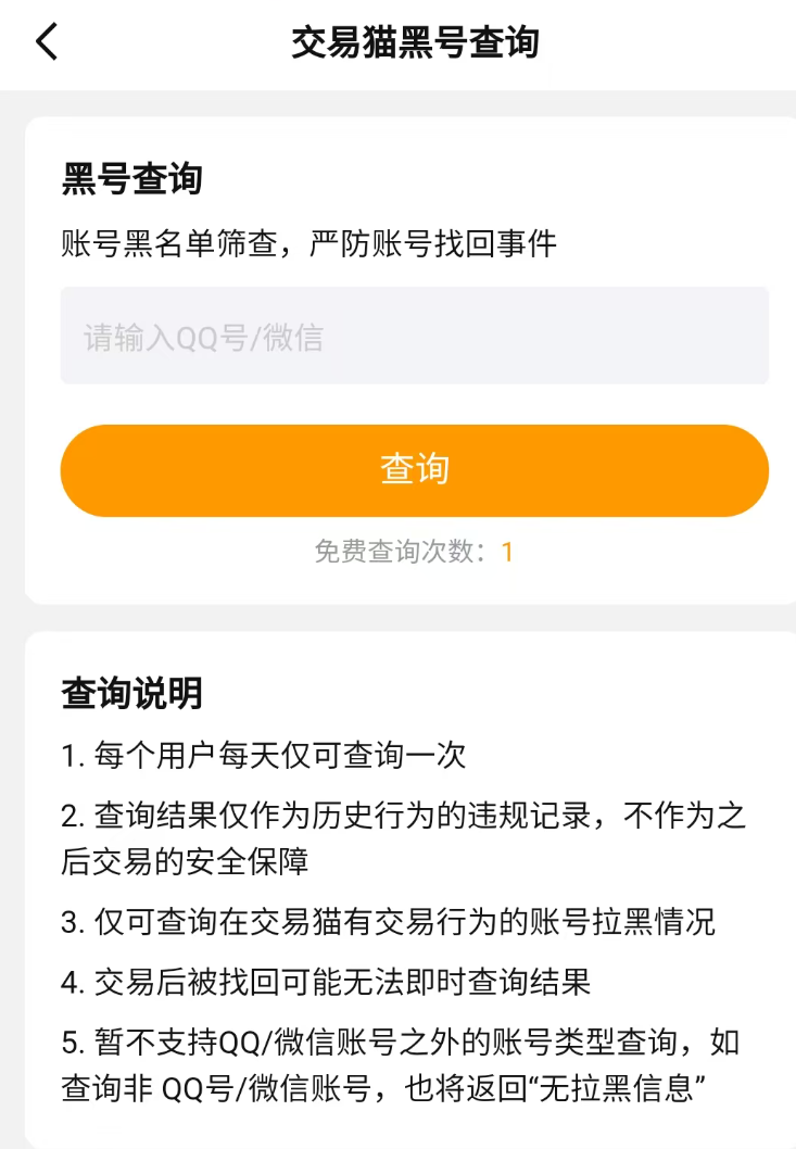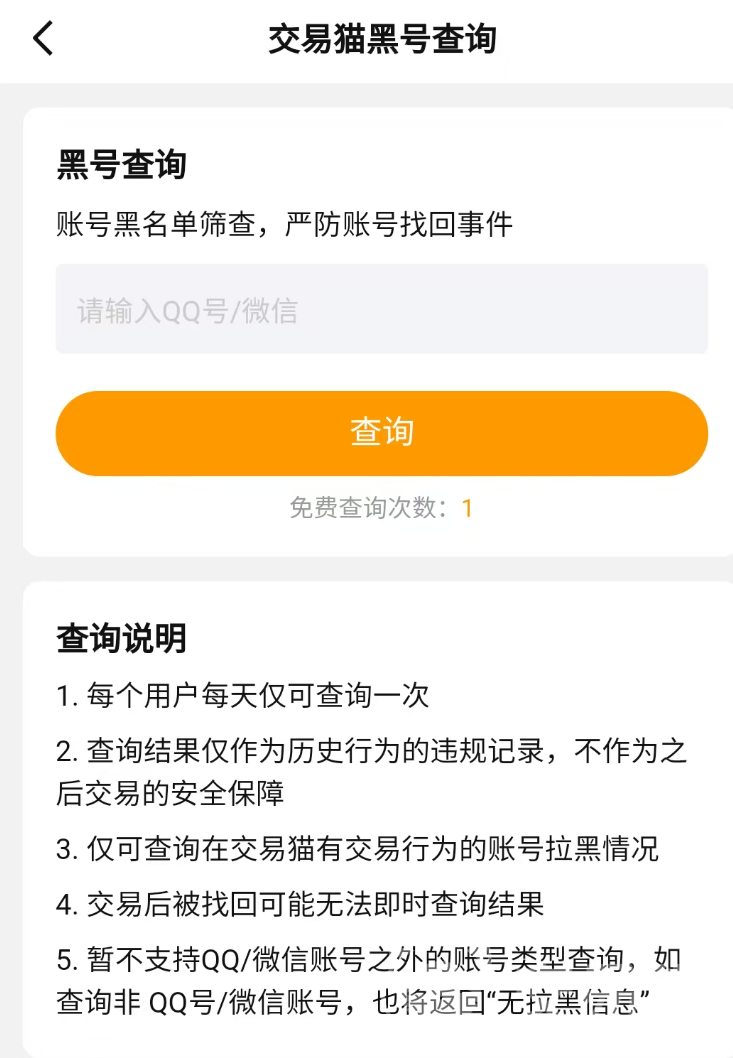 交易猫针对各个环节都出具了极为严格的安全条款,且还直接在平台首页开放了安全中心的入口,在此界面当中可以查验卖家发来的网址是否真实有效,还可以向平台索要QQ或微信账号来进行黑号查询,检测该账号在交易猫当中是否有过违规行为,若是在过程当中发现卖家有违规操作还可以直接进行举报。