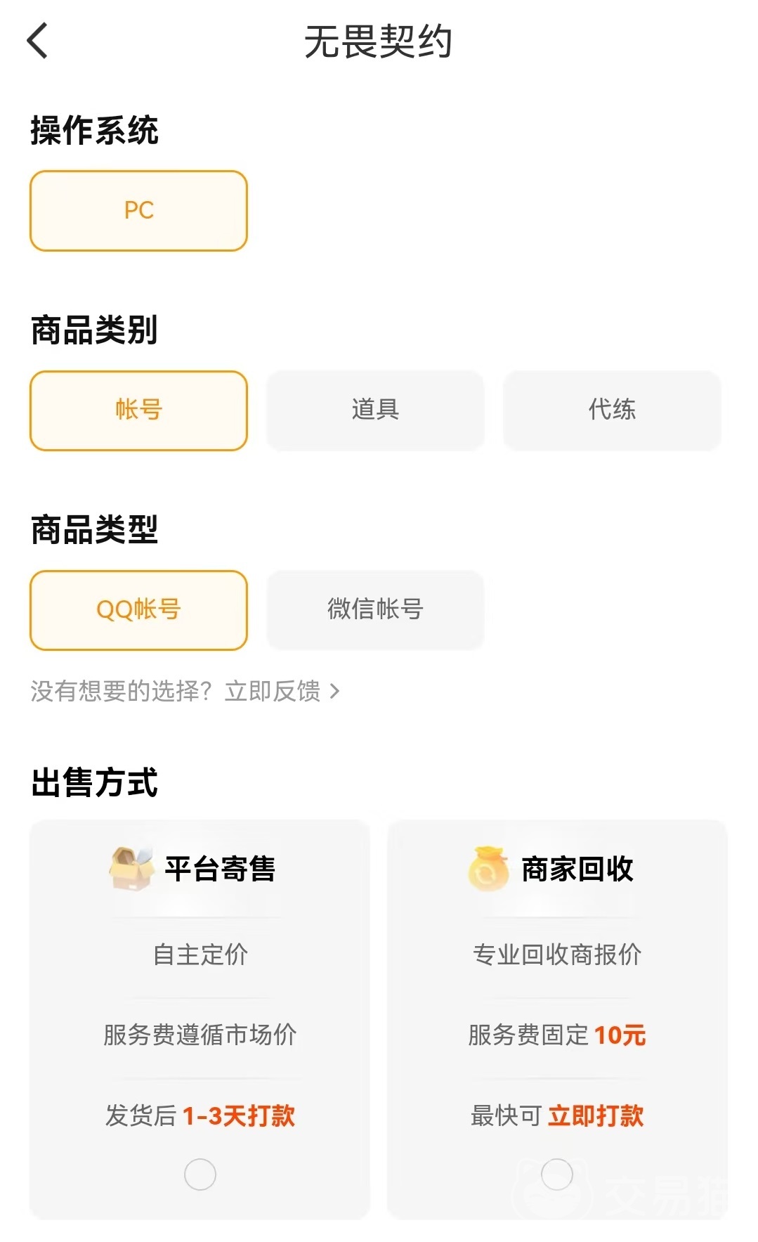 在交易猫出售账号之前,可以先进行免费估值,这是自身非常独特的服务。点击界面中的免费估值,就可以选择无畏契约,然后根据要求逐步输入,就可以得到比较准确的价格了。如果符合自己预期,就可以在这里直接上架,选择好卖账号之后继续搜索无畏契约,分为两种不同类型。可以选择平台寄售,也可以选择商回收。商家回收优势是服务费比较低,只有固定10元,而且是专业回收商报价也很可靠。交易速度快,最快直接就能打款,适合快速变现。平台寄售好处是可以自主定价,能出售稍微高一些,服务费遵循市场价按比例抽取,在发货之后,1~3天就可以直接打款。