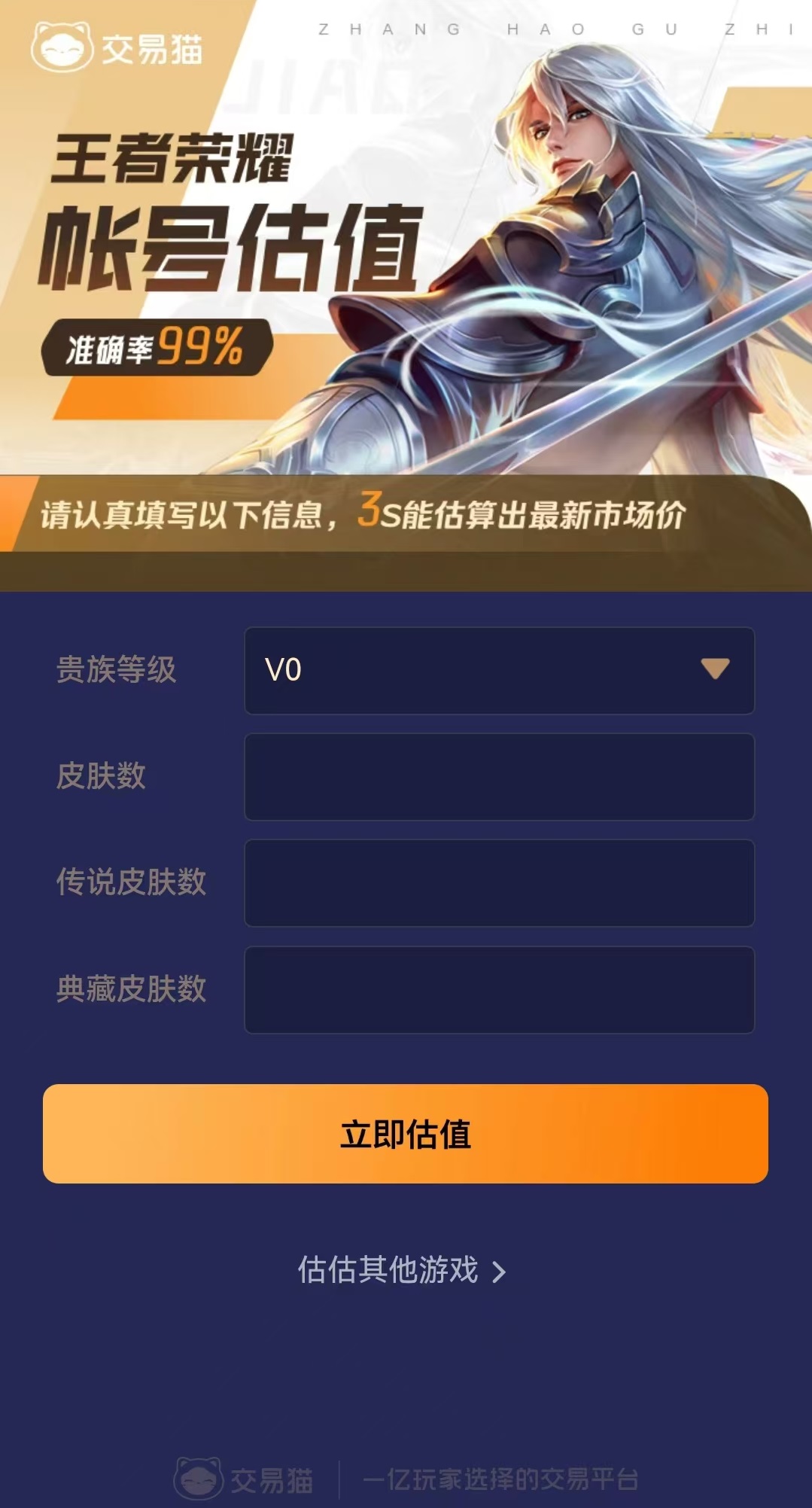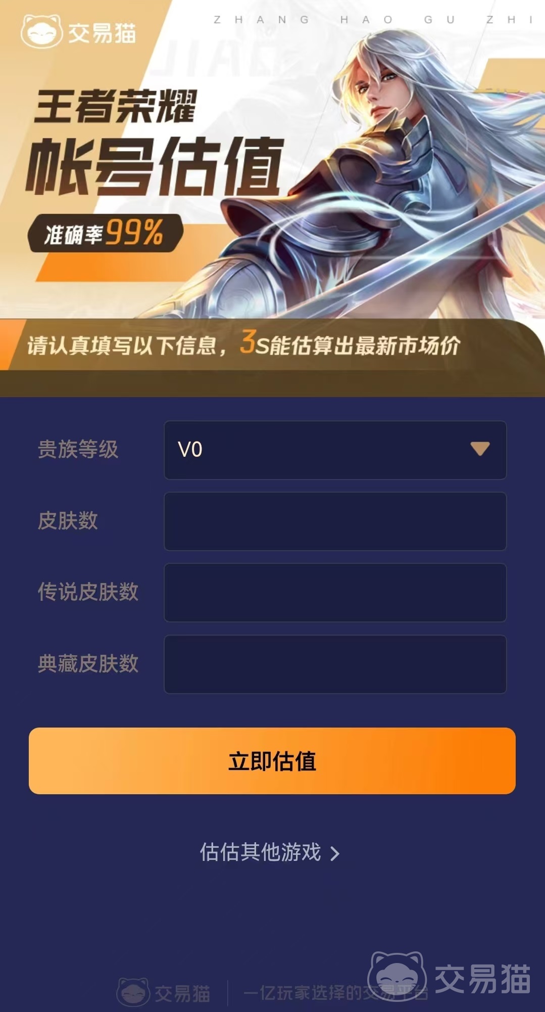 由于王者v10号的账号情况不一定都相同,比如皮肤拥有情况不同,限定数量不同,所以导致的价格是有一定差距的。简单来说,王者皮肤的价值是绝版限定>普通限定>常驻皮肤。不返厂的皮肤价格必定会高很多,哪怕大家购买时,它的价格和常驻皮肤差不多,所以具体为v10账号的情况还要根据大家账号内的资源来看。不过值得一提的是,小编带来的这款交易猫拥有账号估值服务,系统会智能为大家评估当前账号的价格,小伙伴们可以以此来评判。