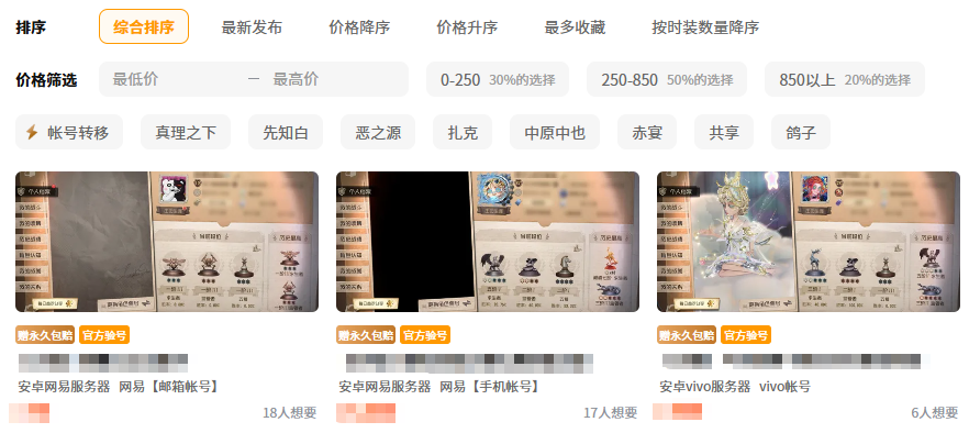 值得一提的是,这个平台不仅账号资源丰富,而且十分安全靠谱,是一款官方正版的交易平台。第五人格账号不仅有官服号,还有各种其他渠道服的账号,而官服账号一般比渠道服的账号价格会高一些,如果小伙伴们有想要体验的皮肤,官服号价格比较高的话也可以试试购买渠道服的账号,后续不玩也可以转手在平台上再次卖出。