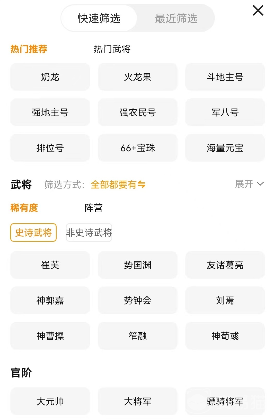 最后一项是自身选择账号非常方便,在筛选功能中提供了很详细的模板,包括拥有哪些武将,VIP等级,将魂数量和其他各个方面,在这里都能直接进行选。这样就可以快速从海量商品中直接找到最适合自己的部分。锁定之后再结合价格排序,就能快速找到性价比最高的账号。