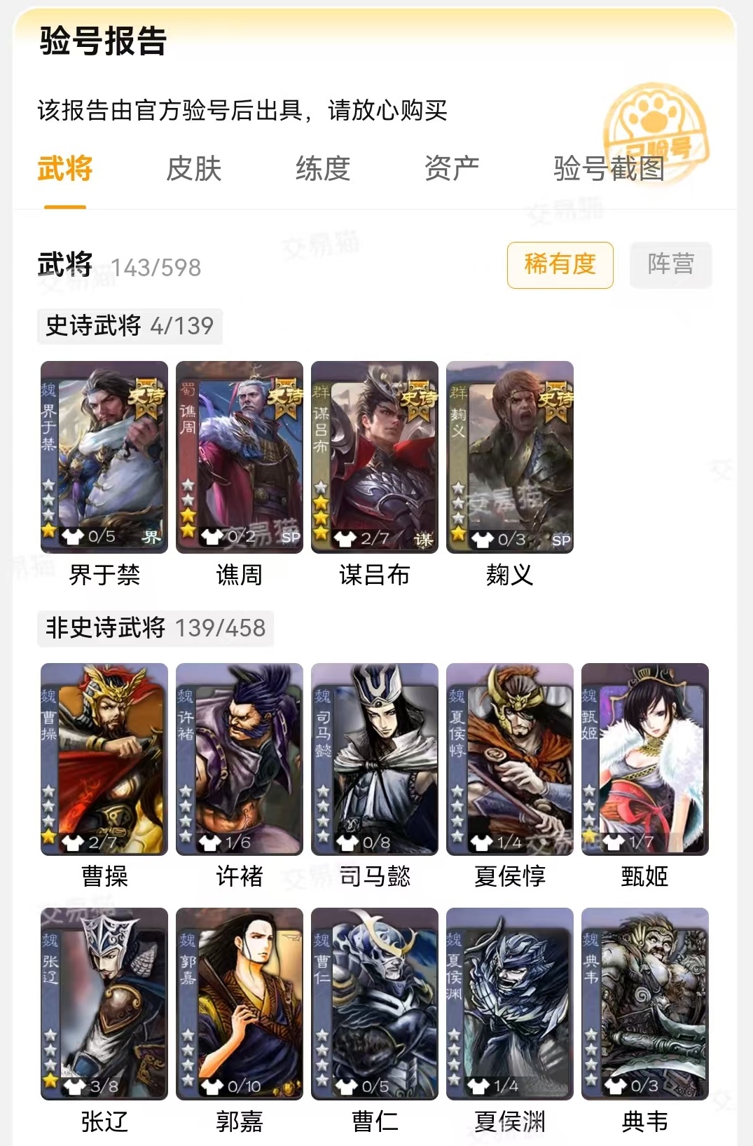 三国杀这款游戏经过多年的发展,现在有着很多可收集的部分,这些很多都是绝版所以很多老账号都极有价值,这也给交易带来了基础,今天小编来介绍一下三国杀买号去哪里好。现在新玩家想要上手三国杀,直接购买一个老号是最佳选择,里面的内容非常充足可应对各种模式。最好的选择就是交易猫,交易猫是最安全的手游交易平台,这里提供的都是精选商品,官方验号覆盖范围超过100款热门游戏,验号信息既真实又完整准确。