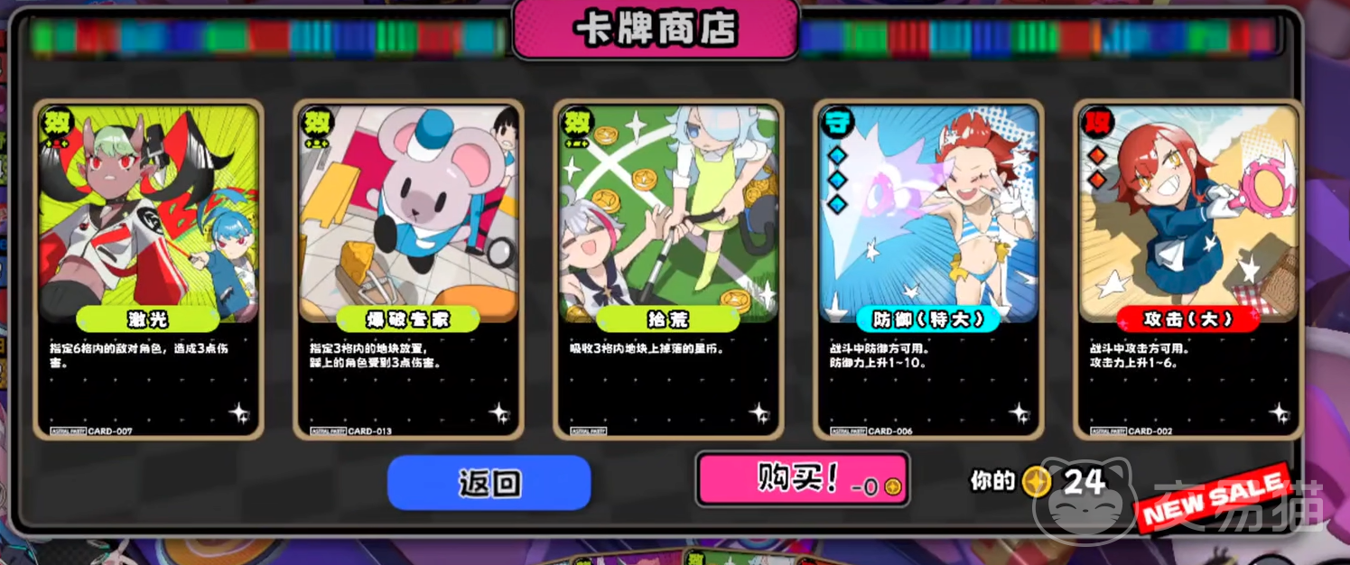 地图格子通过颜色编码实现功能区分:蓝色格为商店区,可消耗金币购买卡牌;黄色格为事件区,触发随机效果(含增益、减益、资源变动等);绿色格为初始点,红色格为结算点——仅当角色抵达结算点时,系统才会校验胜利条件是否达成,途中积累的金币、卡牌数量均不构成直接胜出依据。