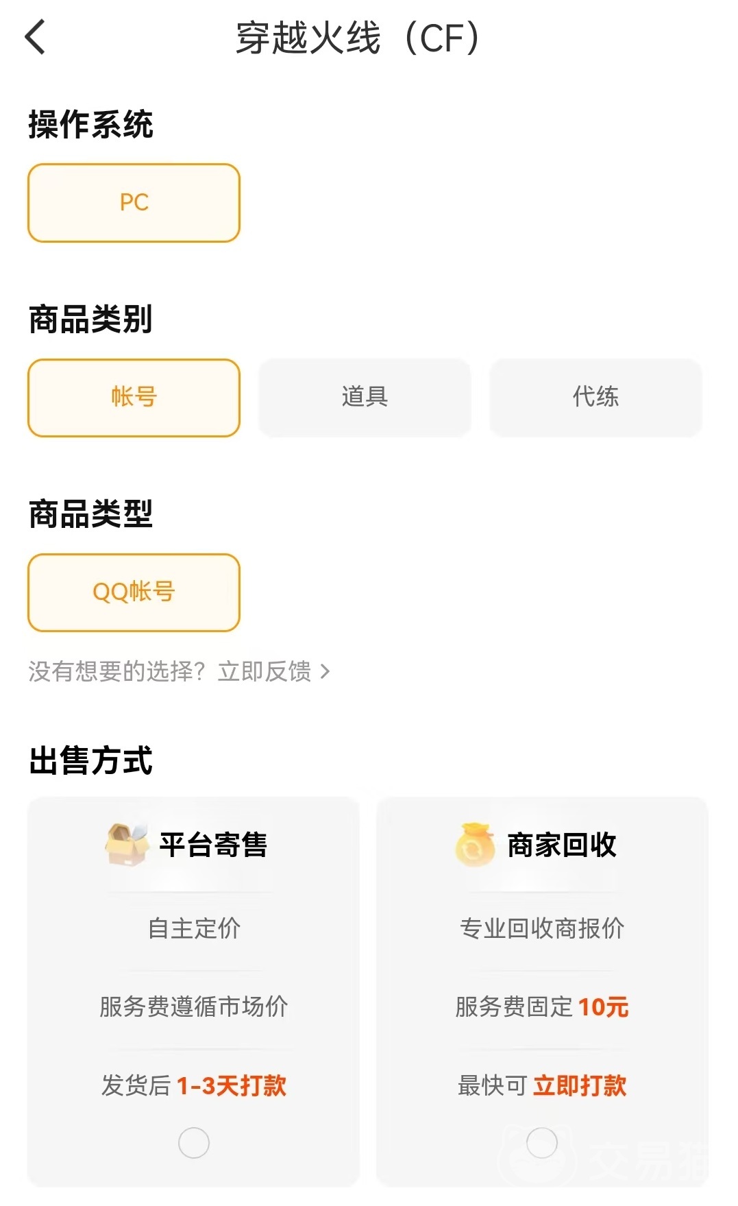 登录进去之后可以进行更精准估算,并提供全面的报告。也可以通过其他商品链接估值的方式查看其他人商品来进行价格估算,这两种都可以非常轻松的拿到自己账号的报价,如果感觉合适就可以在这里直接上架出售了。想要卖账号,在出售功能中搜索Cf之后,在这里跟随系统引导就可以快速出售。可以选择平台寄售的方式,也可以直接由商家进行回收。如果想要更快的拿到收益,那么就直接选择商家回收,服务费比较低,最快立即就能打款。如果不着急出售,可以选择平台寄售,发货后1~3天就能打款,售价相对高一些。