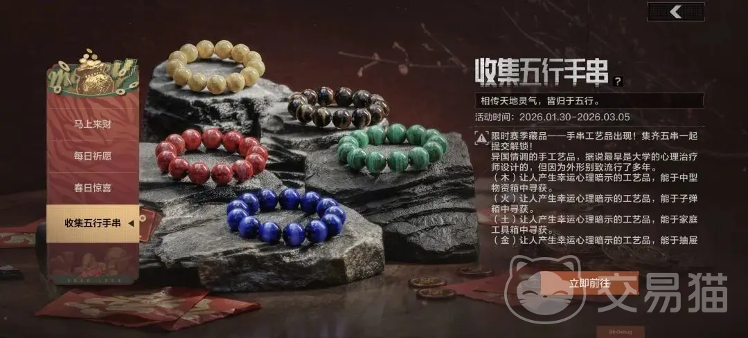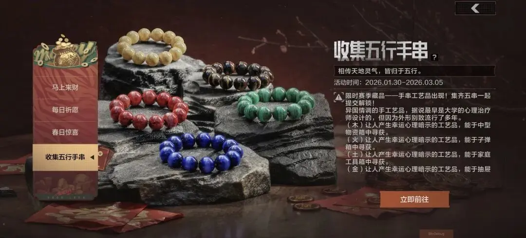 赛季专属藏品“五行手串”收集活动同步启动。玩家需在局内指定容器中搜寻散落的手串部件,共含五种颜色类型,集齐整套并提交后,可解锁特殊档案物资。自2月6日起,对局中将随机刷新惊喜空投与贺岁红包,掉落物中存在一定概率包含马年大金。