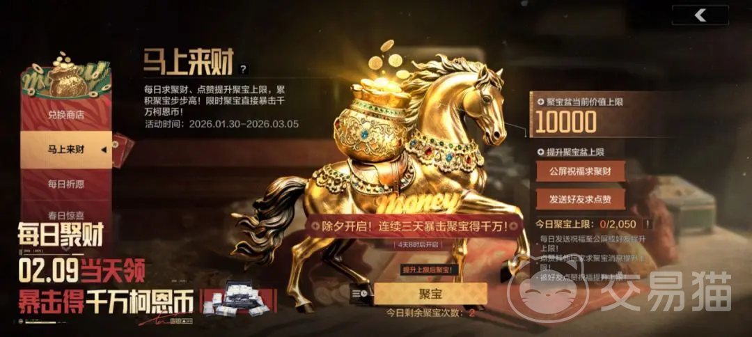 代币获取方式多样:在农场、山谷、电视台、要塞等地图中击败随机出现的神秘来客;或每日参与祈愿活动,均可稳定获取大量“马上发财”代币。同步开启的“马上来财”玩法支持每日求聚财操作,点赞行为可提升聚宝价值上限;2月9日当日登录游戏,更可触发暴击聚宝机制,有概率直接获得千万科恩币奖励。