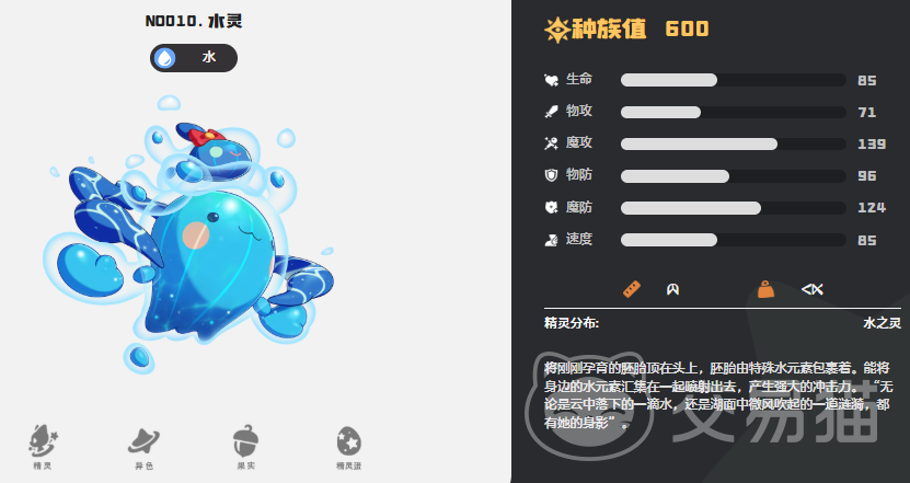 第五位是水系基础精灵水灵。作为新手入门首选之一,其操作友好、成长平滑。天赋“浸润”可使所有水系技能的能量消耗统一减少1点,大幅优化能量循环效率。配合“水枪”“潮涌”等低耗技能,能快速达成多段连击,尤其在面对火系或岩系对手时,兼具克制优势与技能释放密度。