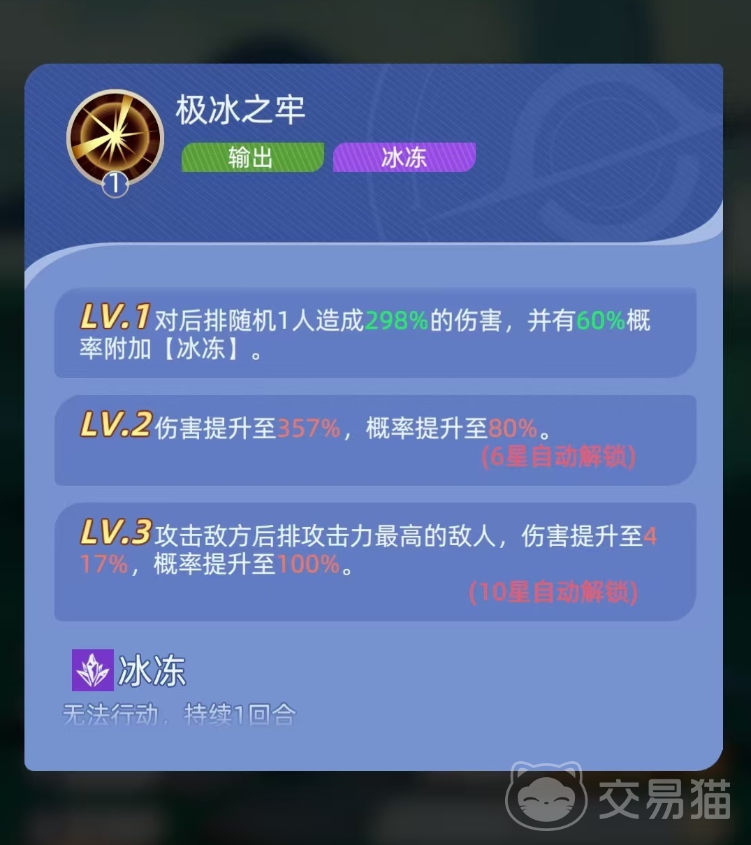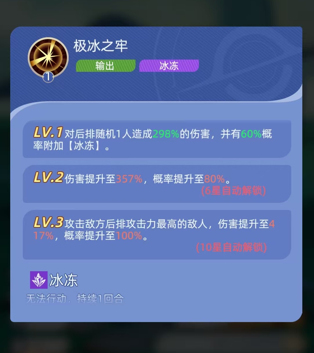 二技能具备被动回血特性:每回合开始时,若自身当前生命值低于最大生命值的50%,则恢复相当于最大生命值10%的生命值。该机制显著强化其续航能力,使其在辅助角色减员或治疗压力骤增时仍能维持前排站位稳定性。三技能“寒冰壁垒”为反制型减益技:每次受到普攻或技能攻击时,均有概率对攻击者施加1层“伤害降低”效果;技能等级提升后,额外附加1层“速度降低”效果。两类减益均可叠加至最高5层,持续压制敌方输出效率与出手节奏,为我方创造多轮先手优势。