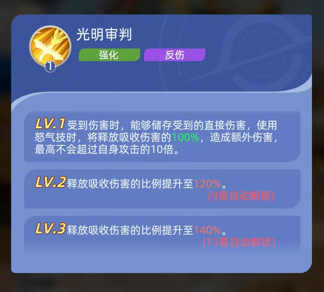 三技能为反伤蓄能机制:每次受到伤害均可积累一定比例的“怒意值”,当释放大招(即怒气技能)时,将此前储存的所有反伤量一次性爆发,转化为对敌方全体或指定目标的额外真实伤害。这一设定打破了传统坦克纯承伤的职能边界,赋予其可观的战术反击输出潜力,实现攻防一体的前排价值再定义。