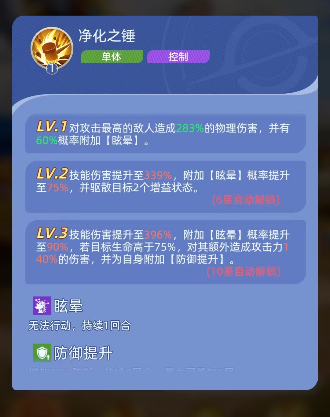 瓦尔德迪欧定位为高容错率的守护型坦克,手持巨型圣锤,具备典型的圣骑士风格视觉设计与战斗逻辑。其一技能为锁定式单体压制技:优先选取敌方攻击属性最高的单位发动打击,造成基础伤害的同时,附带概率性眩晕效果,并为自身叠加持续数回合的防御力提升状态。该机制使他在承受集火时具备显著的生存韧性,是构筑稳定前排防线的核心支点。