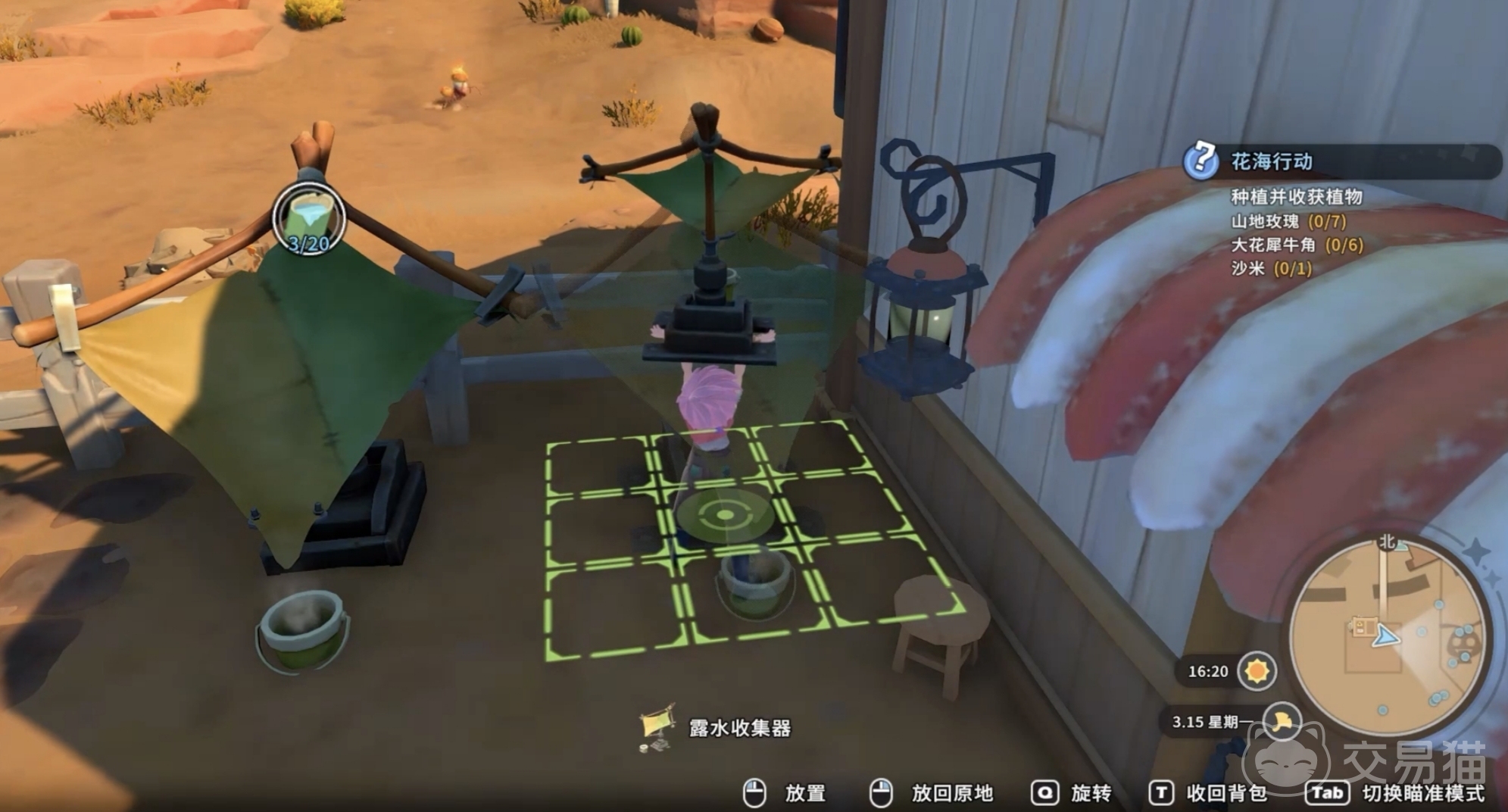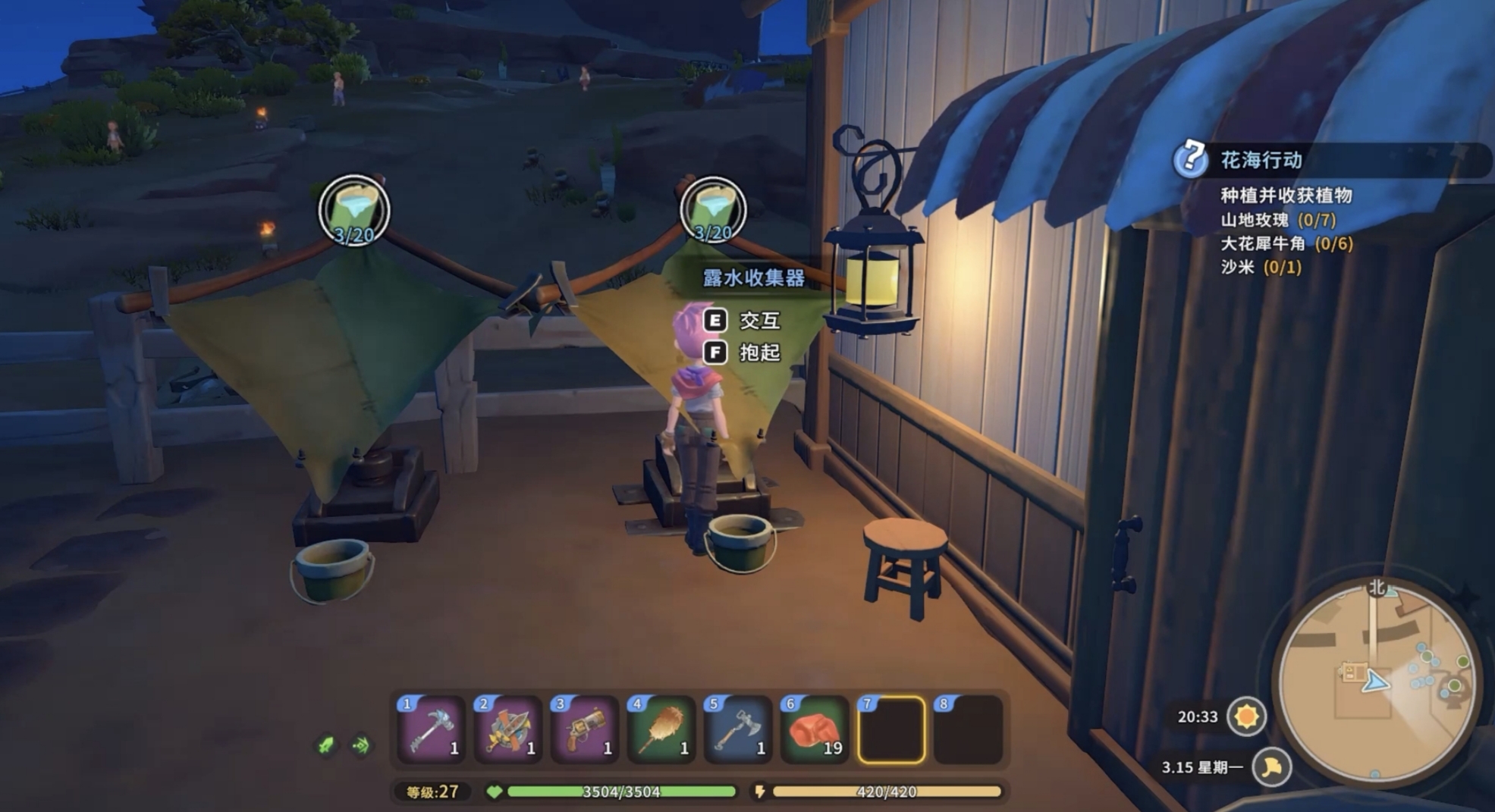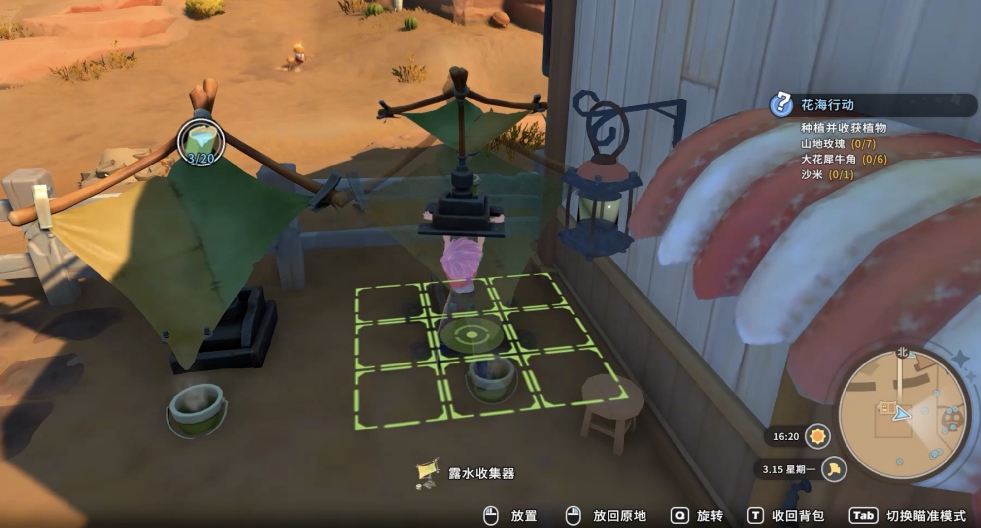 露水天然凝结于鲜活植被表面,采集方式强调环境交互性。玩家在小镇外围活动时,可对健康生长的树木进行轻踢操作——该动作会触发枝叶震颤,使附着露珠自然滴落并自动计入背包。除乔木外,仙人掌类耐旱植物同样具备露水生成机制,触摸即可采集。需注意:已枯萎或无生命特征的植株不参与此机制,仅保持青翠状态的绿色植物才可持续产出露水。