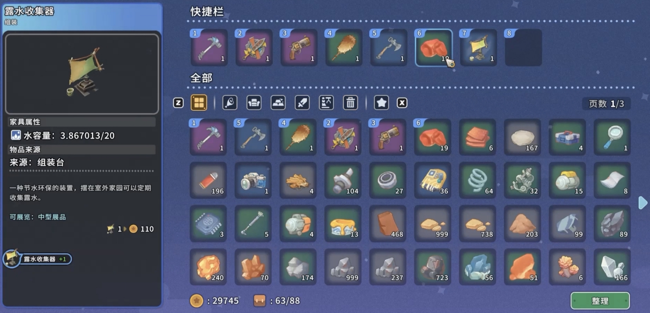 资源采集行为具有连带收益特性。当玩家执行砍伐树木或开采石矿操作时,存在概率性掉落露水,建议在常规资源收集过程中同步留意地面拾取。更高效率的稳定来源是部署“露水收集器”——该装置需先从齐恒处获取图纸,并配合数据光盘完成解析解锁。制作配方固定为:木棒×3、简易皮革×3、大理石砖×2、石槽×2。建成后须置于露天土地,其夜间凝结效率达到峰值,玩家可在次日正午前完成一次性收取。