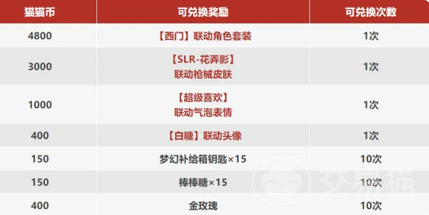 猫猫币是本次联动的核心货币,可用于在活动商店中兑换多项限定奖励,包括联动主题枪械皮肤、角色套装、气泡表情、头像框等。不同奖励所需猫猫币数量不一,例如棒棒糖、金玫瑰等道具均有对应消耗标准,具体数值请参考活动内公示图示。