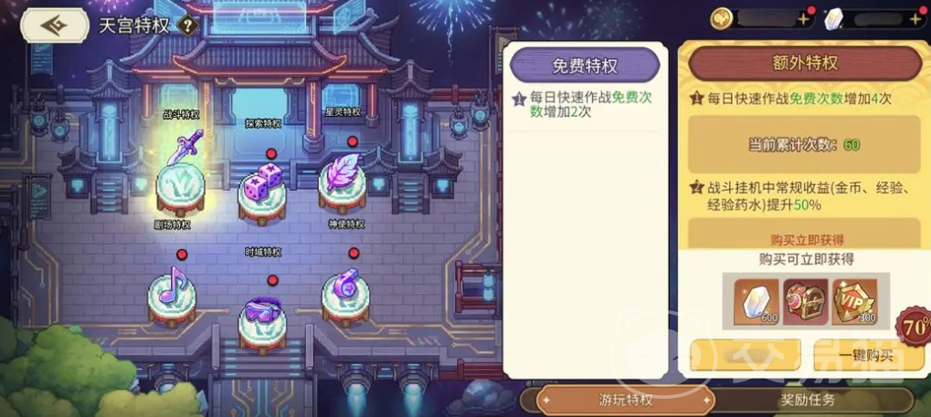 玩家可通过触碰天宫场景中的神器,免费激活六大限时特权;若购买指定礼包,还可进一步解锁额外加成效果。每日消耗曜晶召唤锦鲤,将随机获取对应等级奖励——锦鲤品质越高,所获资源越珍贵,涵盖角色突破材料、高级装备强化石等核心养成资源。
