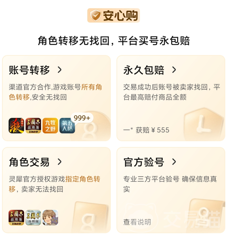 交易猫从根源上就开始严格要求每个环节,首先对卖家信息查验特别严格,强实名加不定时人脸确保账号来源为个人,其次就是交易猫团队将会对每个账号进行验号流程,出具最为准确的验号报告,也相当于是每个账号独特的身份标签,在独特的”安心购“流程当中,每个步骤都是和安全环环相扣。